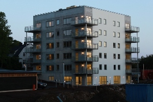 Nybyggnation av flerbostadshus, 20 lägenheter på kv Mejeriet vid sköna Nossan i Nossebro – så här fint blev det.